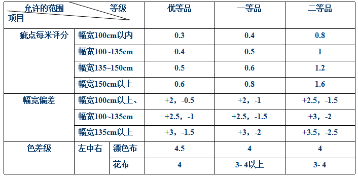 ●外觀質(zhì)量檢驗(yàn)根據(jù):染色不勻、染色條花、橫檔、跳花、油污等疵點(diǎn)情況,結(jié)合評(píng)分標(biāo)準(zhǔn)評(píng)分,由評(píng)分?jǐn)?shù)評(píng)等。