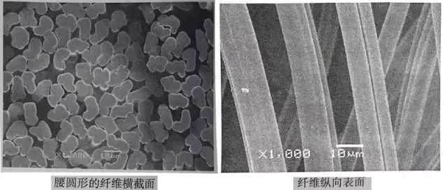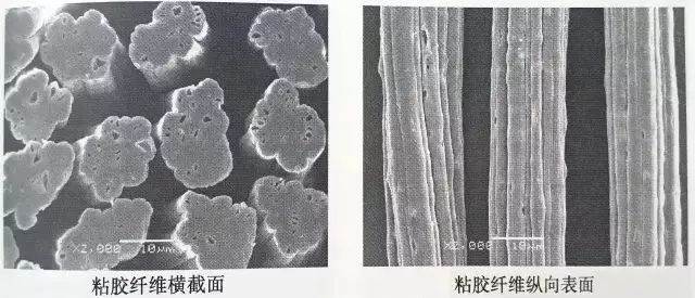 普通粘膠纖維復(fù)雜成型過程的不均勻性會(huì)使常規(guī)粘膠纖維的橫截面呈腰圓形或無規(guī)則狀,內(nèi)部有孔洞,縱向有無規(guī)則溝槽。粘膠具有優(yōu)良的吸濕性、易染性,但是其模量、強(qiáng)度較低,尤其是濕強(qiáng)度低。