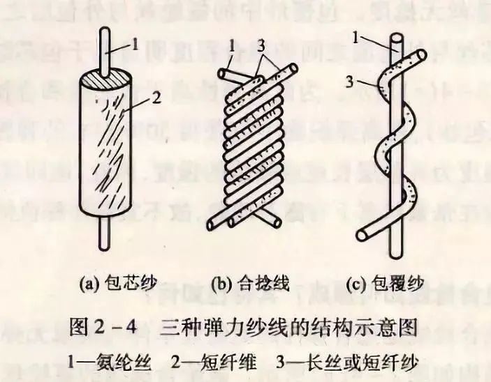 氨綸彈力纖維與其他纖維混合紡成彈力紗,其紗線的形式目前有三種形式:即氨綸包芯紗、氨綸合捻紗和氨綸包覆紗。三種形式的紗線在加工原理、結(jié)構(gòu)性能上有著本質(zhì)的區(qū)別。因此其用途和織造性能也有很大的差別。三種紗線的結(jié)構(gòu)示意圖如圖所示。