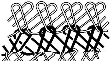 2x2羅紋:瑞士羅紋,連串的正面兩支相連縱行線圈交替背面兩支相連縱行線圈,織片結(jié)構(gòu)擁有高度彈性和不會卷邊。