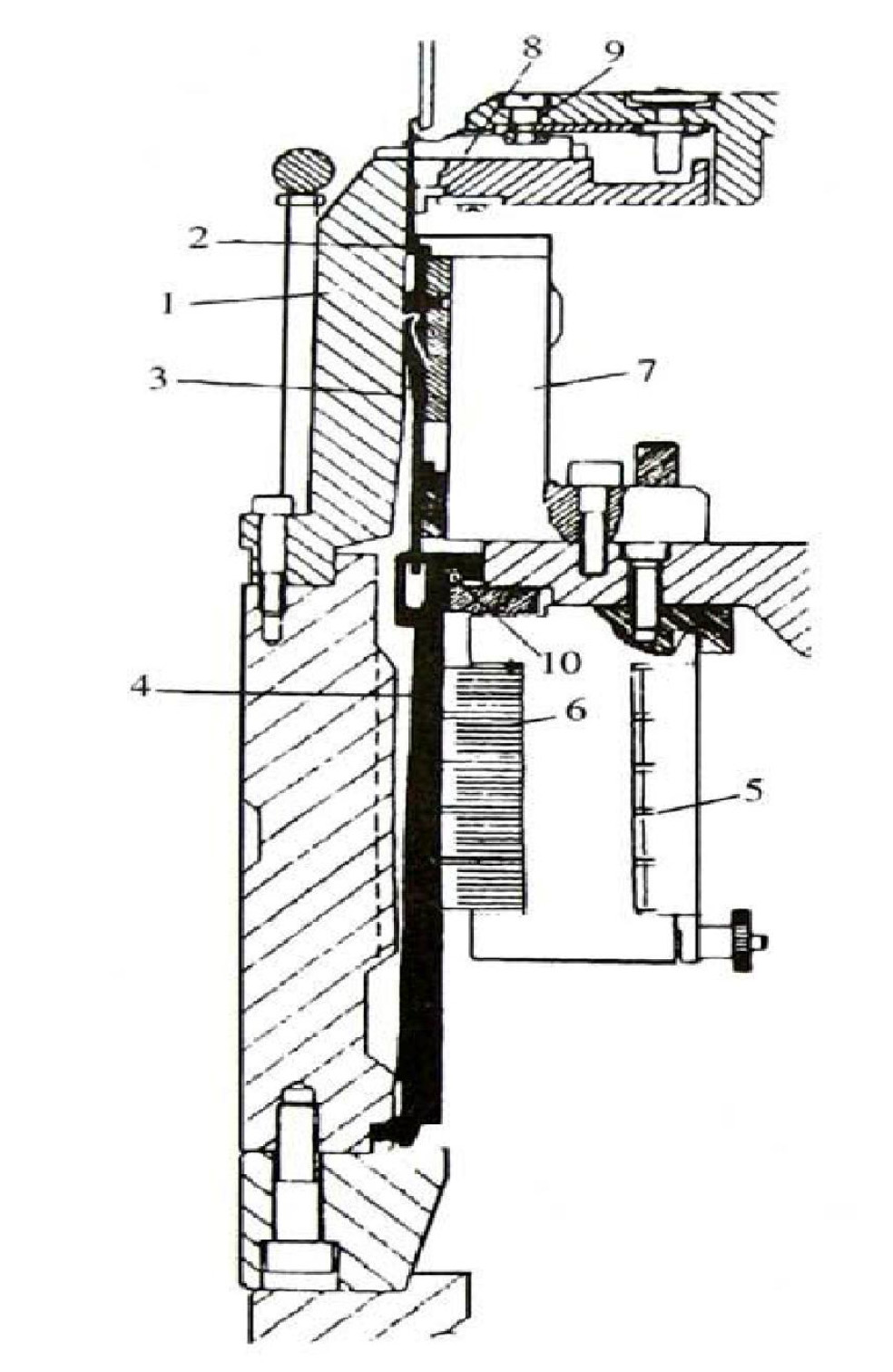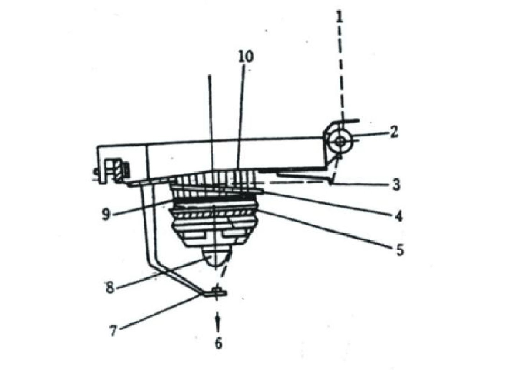 落地紗架上的紗筒經一系列導紗鉤(改變方向)——半儲存式給紗裝置——編織區(qū)域。其中,半儲存式給紗裝置為消極式結紗裝置(如圖4-1),紗線1經張力裝置2、斷紗自停探桿3(斷紗時指示燈8閃亮),切向卷繞在儲紗筒10上。儲紗筒由內裝的微型電動機(老式)或條帶(新式)驅動。當傾斜配置的圓環(huán)4處于最高位置時,它使控制電動機的微型開關接通,或使控制條帶與儲紗筒接觸的電磁離合器通電,從而電動機(或條帶)驅動儲紗筒回轉進行卷繞。由于圓環(huán)4的傾斜,卷繞過程中紗線被推向圓環(huán)的最低位置。當儲紗筒上的卷繞紗圖數達最大時(約4-5圈),圓環(huán)4使電動機開關斷開或電磁離合器斷電,因此,儲紗筒停止卷繞。