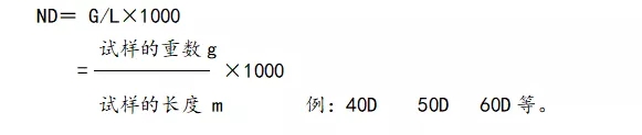 旦尼爾(Denter)制:(一般表示長絲)在公定回潮率時(shí),以9000m長度的重量克數(shù)來表示算稱旦數(shù),用ND表示: