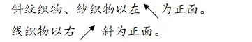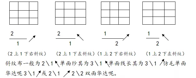 2) 斜紋組織:一個(gè)組織循環(huán)至少要有三根經(jīng)紗和三根緯紗,在組織圖上有經(jīng)組織點(diǎn)或緯組織點(diǎn)構(gòu)成的斜線。斜紋組織的織物表面上有經(jīng)(緯)浮長線構(gòu)成的斜向織紋。
