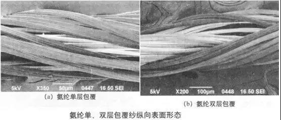 ? 兩者的區(qū)別,我們以氨綸包芯紗和氨綸包覆紗為例。氨綸包芯紗是用短纖維包的氨綸,以氨綸絲為芯,外包非彈性短纖維,拉伸時(shí)芯絲一般不會(huì)外露。氨綸包覆紗是用化纖的長(zhǎng)絲包氨綸,也是以氨綸絲為芯,非彈性短纖維或長(zhǎng)絲按螺旋形的方式對(duì)伸長(zhǎng)的氨綸絲予以包覆而形成的彈力紗。在張緊狀態(tài)下有露芯現(xiàn)象。