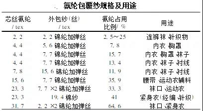 氨綸包覆紗主要用于需求高彈性的織物,部分用于梭織物。用包覆紗織制的面料較厚實(shí),特別適用于織造運(yùn)動(dòng)緊身衣,如游泳衣、滑雪服等。