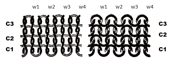 圖1-2是最基本的緯編組織——緯平針組織,該圖表示平針組織的正面和反而,兩面分別由相同形狀的線圈覆蓋。表面這一層的線圈圈柱在上呈V字形的稱作正面,里面這一層的線圈沉降弧在上的稱作反面。圖中的縱向線圈稱為縱行(圖上為W),橫向稱為橫列(圖上為C)。