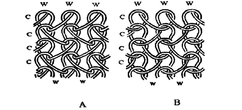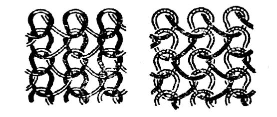 圖1-3表示的線圈是最基本的經(jīng)平組織。圖中A、B沉降弧線圈形狀不同。A為開口線圈,B為閉口線圈,都表示反面線圈。圖1-4表示經(jīng)平組織(閉口線圈)的正反面。正面線圈與緯編相同,呈V字形,反面線圈沉降弧的圓弧變長,形成橫向長的V字形。