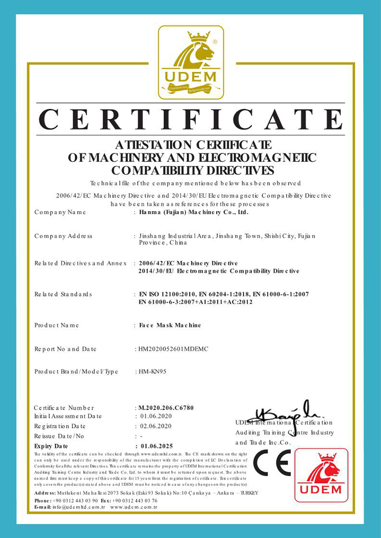 近日,我公司生產(chǎn)的口罩機(jī)經(jīng)歐盟CE認(rèn)證機(jī)構(gòu)檢測,通過了各項指標(biāo)測定,獲得歐盟認(rèn)證機(jī)構(gòu)頒發(fā)的CE認(rèn)證證書,取得了進(jìn)入歐洲聯(lián)盟市場的銷售通行證。我公司目前認(rèn)證內(nèi)容包括大圓機(jī)、濕紙巾,口罩機(jī)系列產(chǎn)品,此次“漢馬牌”口罩機(jī)獲得CE認(rèn)證這一標(biāo)準(zhǔn)的證書,標(biāo)志著漢馬牌的產(chǎn)品在外國市場上進(jìn)一步得到認(rèn)可,符合公司長遠(yuǎn)的發(fā)展目標(biāo)。