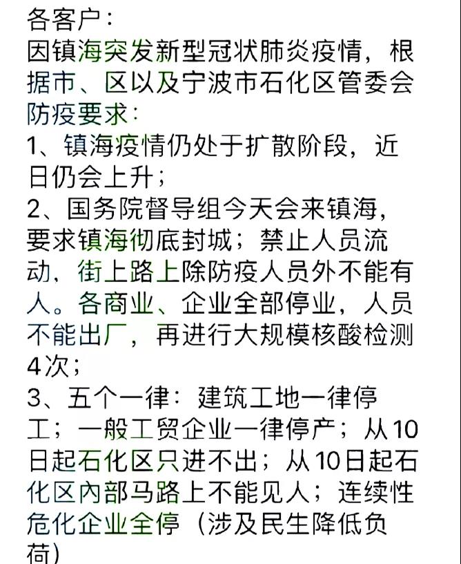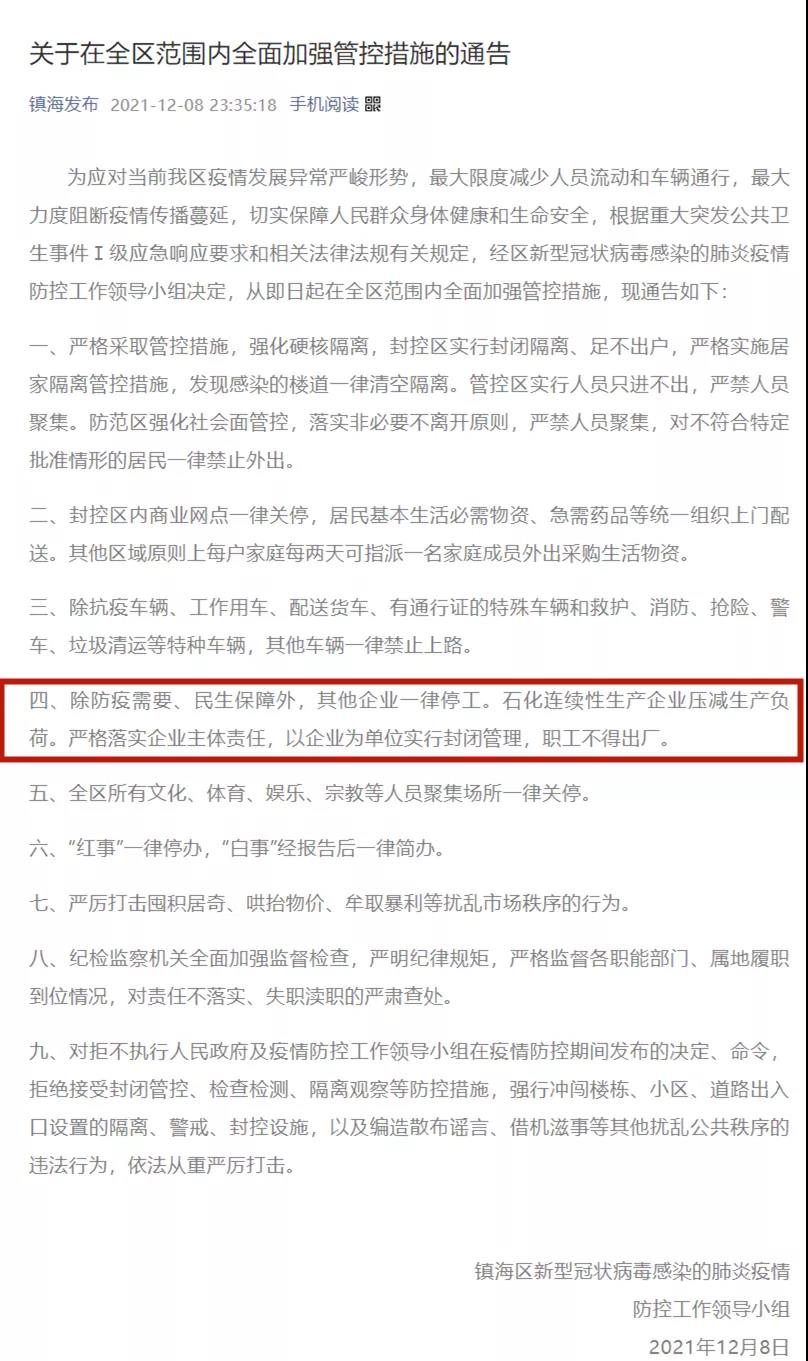 紹興上虞啟動I級應急響應,多個區(qū)域臨時實施封閉管理。除防疫需要和民生保障以外,區(qū)域內其他各類企業(yè)暫時停工。另據部分企業(yè)表示,全區(qū)所有工業(yè)企業(yè)一律實施停產防疫,非化企業(yè)12月9日14時起立即嚴格執(zhí)行停產防疫措施,化工企業(yè)12月9日14時起嚴格執(zhí)行停止投料,啟動執(zhí)行安全停產方案,有檢維修等作業(yè)的一并執(zhí)行停止作業(yè)。