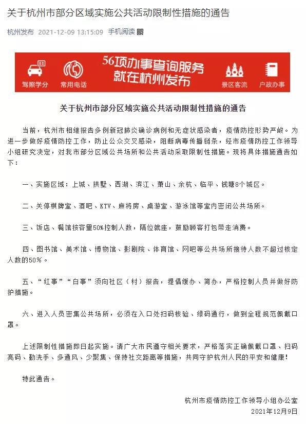 經市疫情防控工作領導小組研究決定,對杭州市部分區(qū)域公共場所和公共活動采取限制性措施。上城、拱墅、西湖、濱江、蕭山、余杭、臨平、錢塘8個城區(qū),關停棋牌室、酒吧、KTV、麻將房、桌游室、游泳館等室內密閉公共場所等。