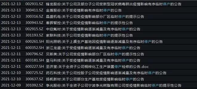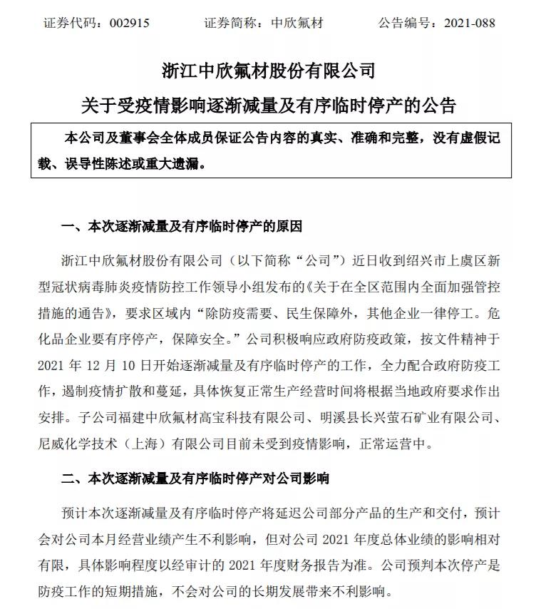 中欣氟材:于2021年12月10日開始逐漸減量及有序臨時停產,具體恢復正常生產經營時間將根據當地政府要求作出安排。