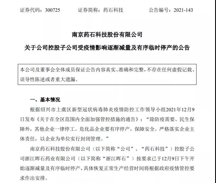 藥石科技:公司控股子公司浙江暉石藥業(yè)有限公司按要求已于12月9日下午開始逐漸減量及有序臨時停產,具體恢復正常生產經營時間將根據政府疫情管控要求作出安排。預計本次逐漸減量及有序臨時停產將延遲浙江暉石產品的生產和交付,將對浙江暉石經營業(yè)績產生一定的不利影響。
