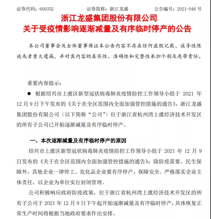 浙江龍盛:受疫情影響,公司位于浙江省杭州灣上虞經濟技術開發(fā)區(qū)的所有子公司已開始逐漸減量及有序臨時停產。上述子公司主要目前主要生產染料、化工中間體、減水劑等化工產品,預計此次臨時停產將延遲公司相關產品的生產和交付,會對公司本月經營業(yè)績產生不利影響。