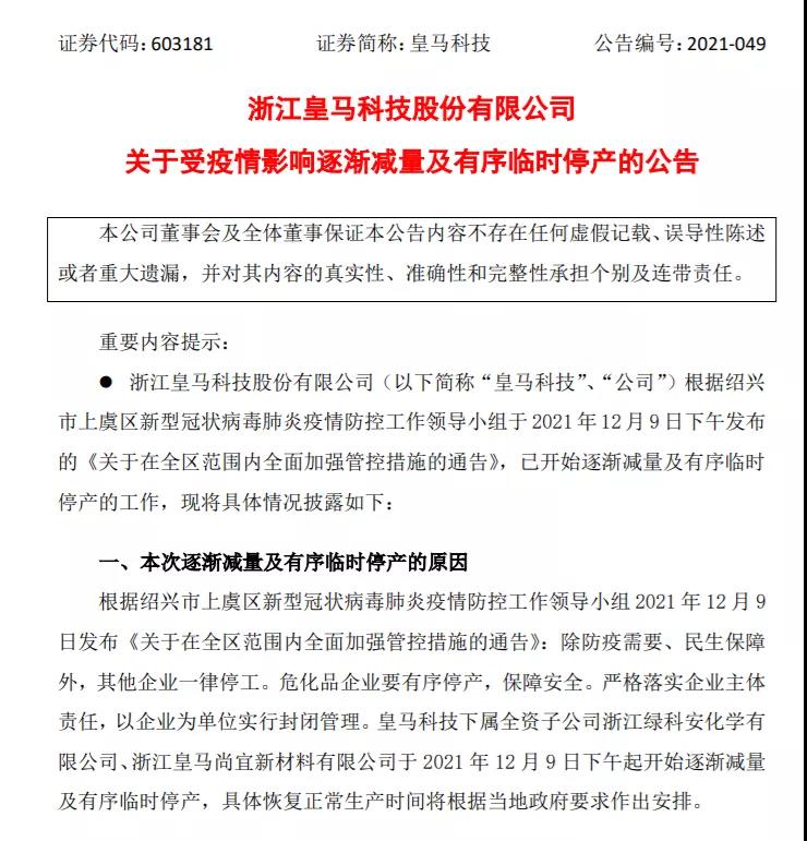 皇馬科技:公司下屬全資子公司浙江綠科安化學有限公司、浙江皇馬尚宜新材料有限公司于12月9日下午起開始逐漸減量及有序臨時停產。預計本次逐漸減量及有序臨時停產將延遲公司產品的生產和交付,預計會對公司本月經營業(yè)績產生不利影響。