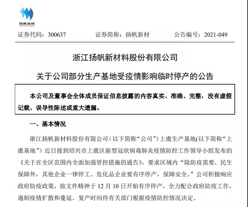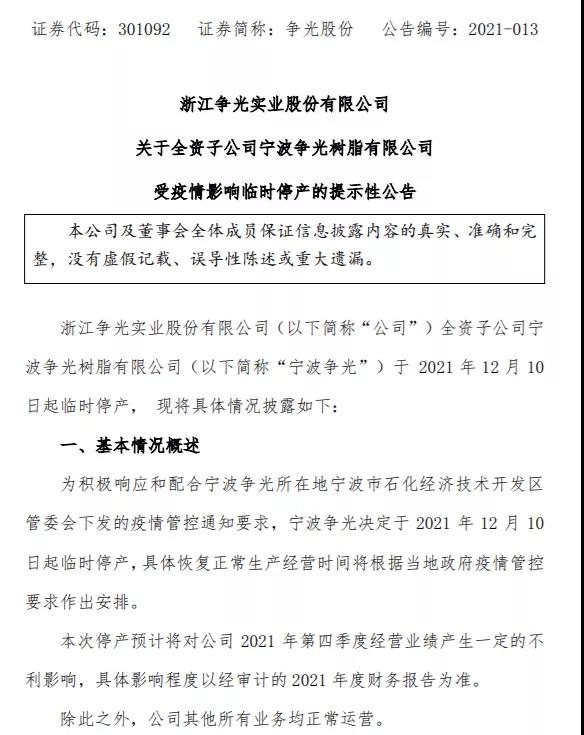 爭光股份:全資子公司寧波爭光樹脂有限公司于2021年12月10日起臨時停產,具體恢復正常生產經營時間將根據當地政府疫情管控要求作出安排。