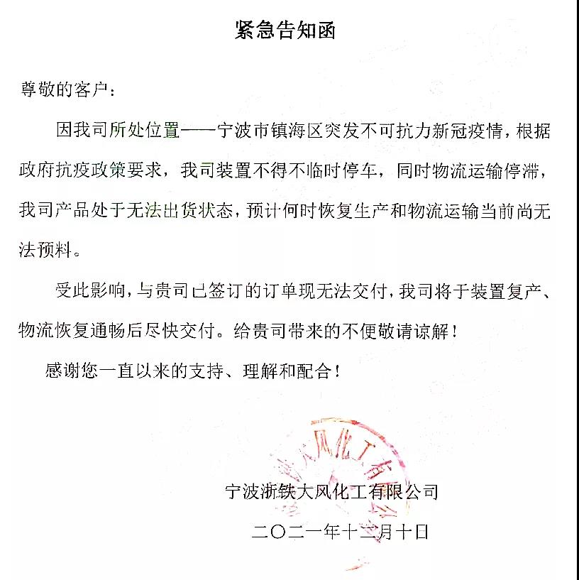 寧波浙鐵大風化工:根據要求,裝置不得不臨時停車,物流運輸停滯,產品處于無法出貨狀態(tài),已簽訂的訂單現無法交付。