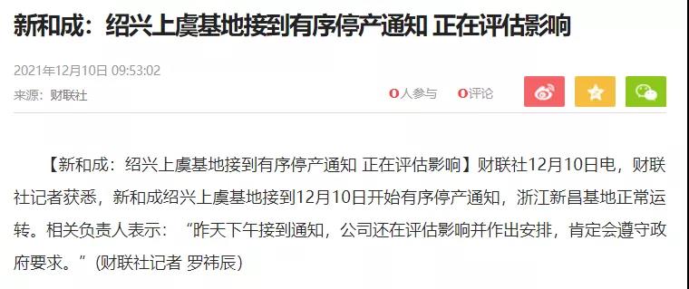 新和成:紹興上虞基地接到12月10日開始有序停產通知,公司還在評估影響并作出安排。