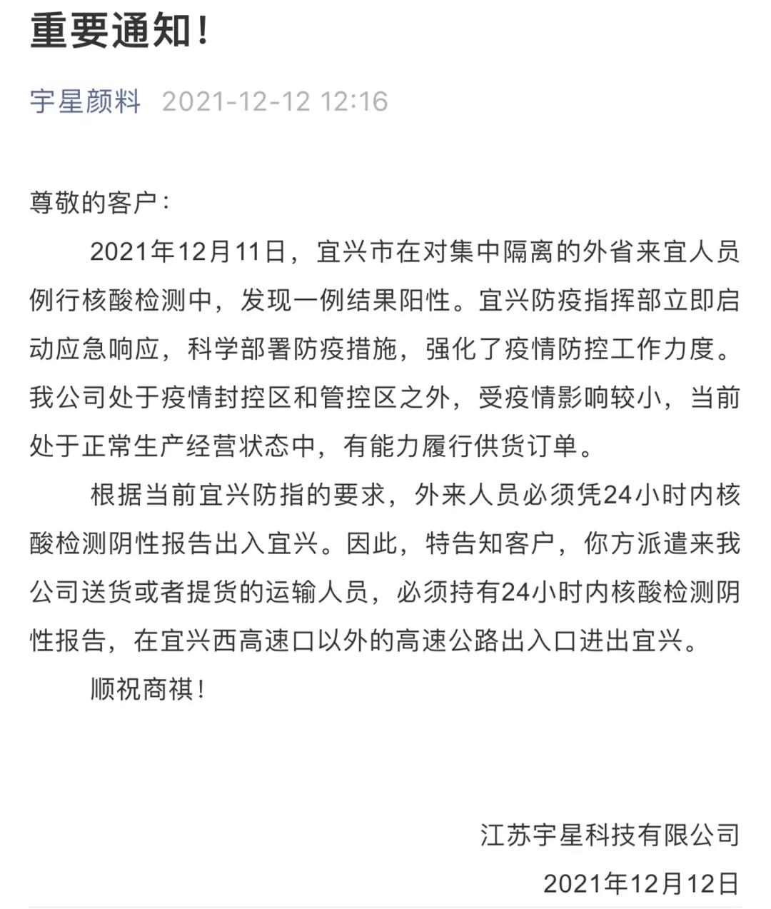 除此之外,江蘇宇星顏料、江蘇三木集團、華祥(中國)高纖有限公司、榮盛集團等當地企業(yè)均提示客戶,由于當地疫情封閉,來提貨或送貨的運輸人員,須持有24/48小時內核酸檢測陰性報告,并注意選擇特定高速口進出,健康碼為紅碼、黃碼的司機及外來人員一律不準進入。