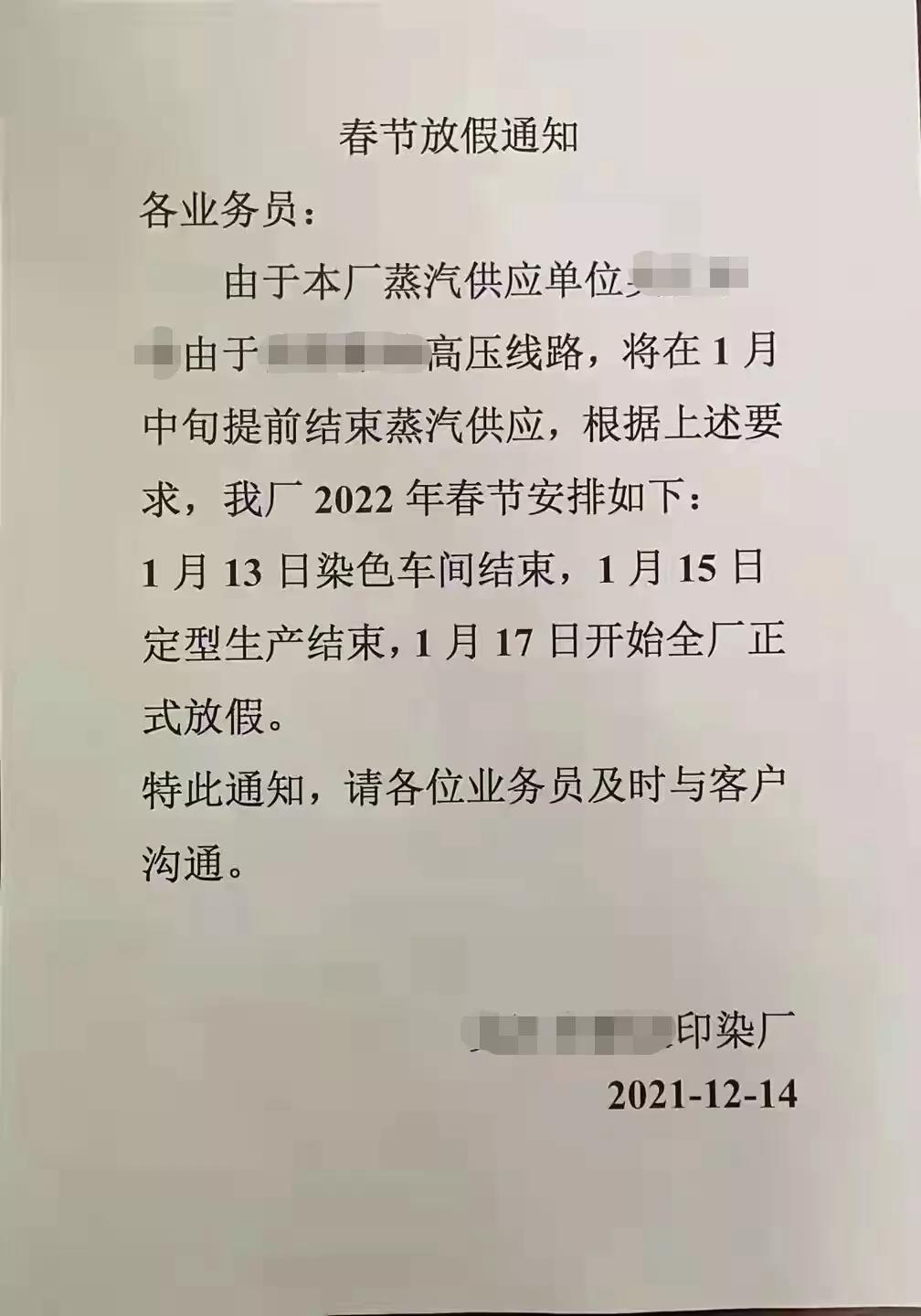 1月中旬放春節(jié),這個(gè)時(shí)間點(diǎn)根據(jù)往年的情況來看是非常合理的,但每年染廠都是堅(jiān)持到最后的工廠,相對印染市場來說是提前的。但也因蒸汽供應(yīng)停止的原因,沒有選擇的余地。