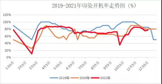 目前,江浙地區(qū)染廠的開機(jī)率處于一個(gè)不溫不火的狀態(tài),維持在7成左右,部分7成偏下,部分8成左右。雖然這個(gè)開機(jī)率已接近今年最高點(diǎn),但與往年相比還是處于一個(gè)較低的水平。往年此時(shí),雖然是一年的收尾階段,但在春節(jié)放假前,往往會有一批訂單下達(dá),為春節(jié)放假的空窗期做好準(zhǔn)備。因此往年的染廠還是偏忙碌的,從圖中也可以看出,前2年的染廠開機(jī)率在8成偏上。
