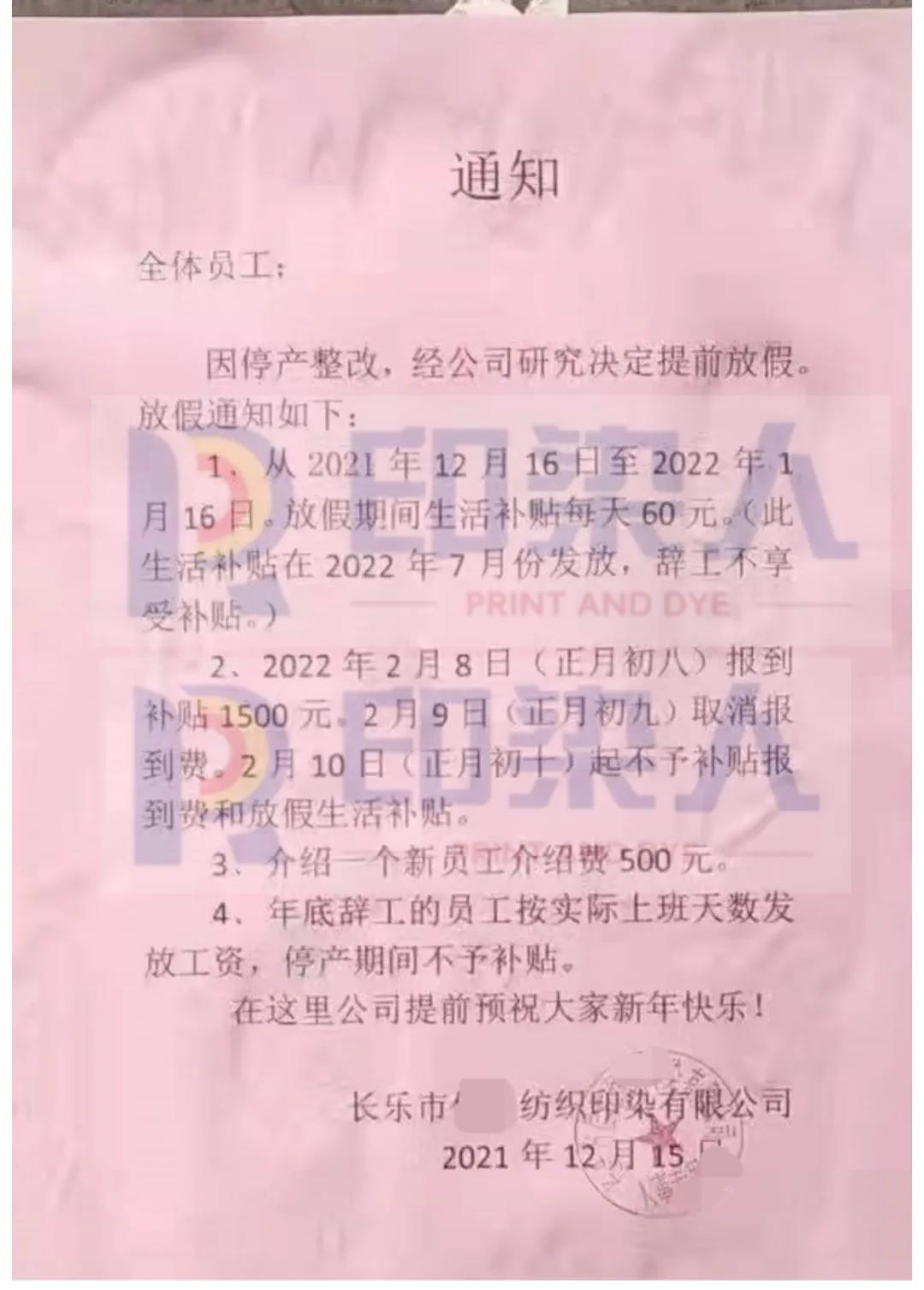 印染人從渠道獲悉,福建長樂某印染廠因停產(chǎn)原因,自12月16日開始放假,2022年2月8日員工報(bào)道,并對(duì)放假期間補(bǔ)助進(jìn)行詳細(xì)說明。