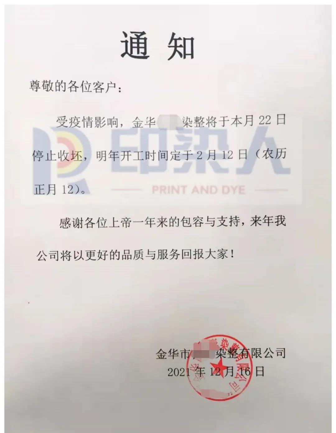 12月16日,浙江金華某染整公司發(fā)出通知,自12月22日停止收胚,明年開工時(shí)候定于2022年2月12日。
