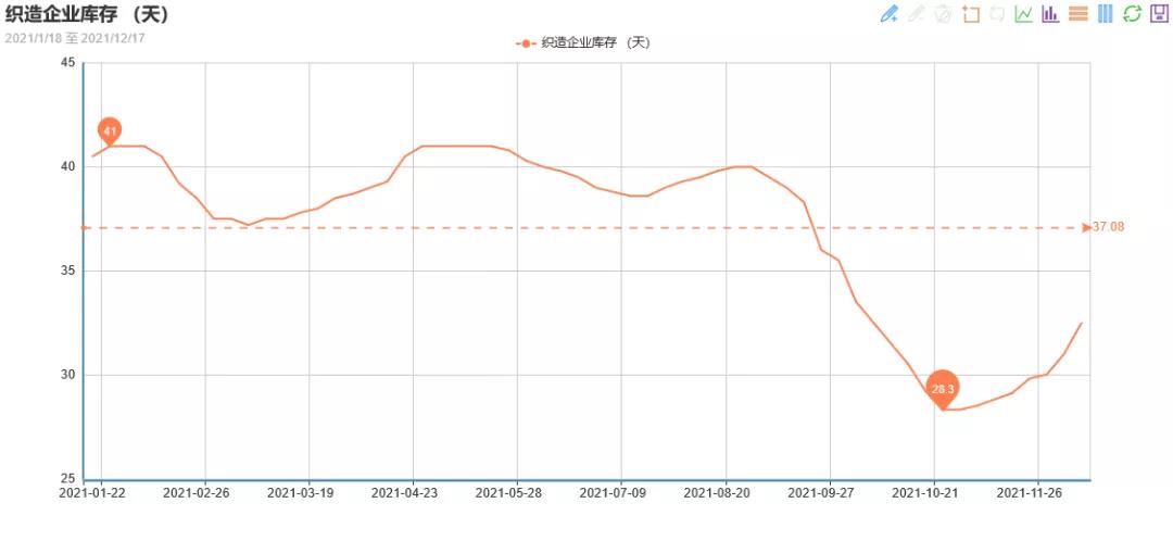另一方面,近期由于浙江疫情及年底需求較差,市場傳言今年紡織廠的放假時(shí)間可能會(huì)出現(xiàn)提前的情況。目前織造廠家的庫存正處于上升階段,據(jù)綢都網(wǎng)數(shù)據(jù)監(jiān)測顯示,目前織造廠家的庫存在32.5天左右,較11月上升4天。另外江浙多地紡織廠及貿(mào)易商反饋,近一周多來常規(guī)坯布詢價(jià)和出貨仍沒有多大起色,成交價(jià)明顯回落,部分廠家調(diào)整幅度超過20%。同時(shí)原料價(jià)格也以小幅陰跌為主。