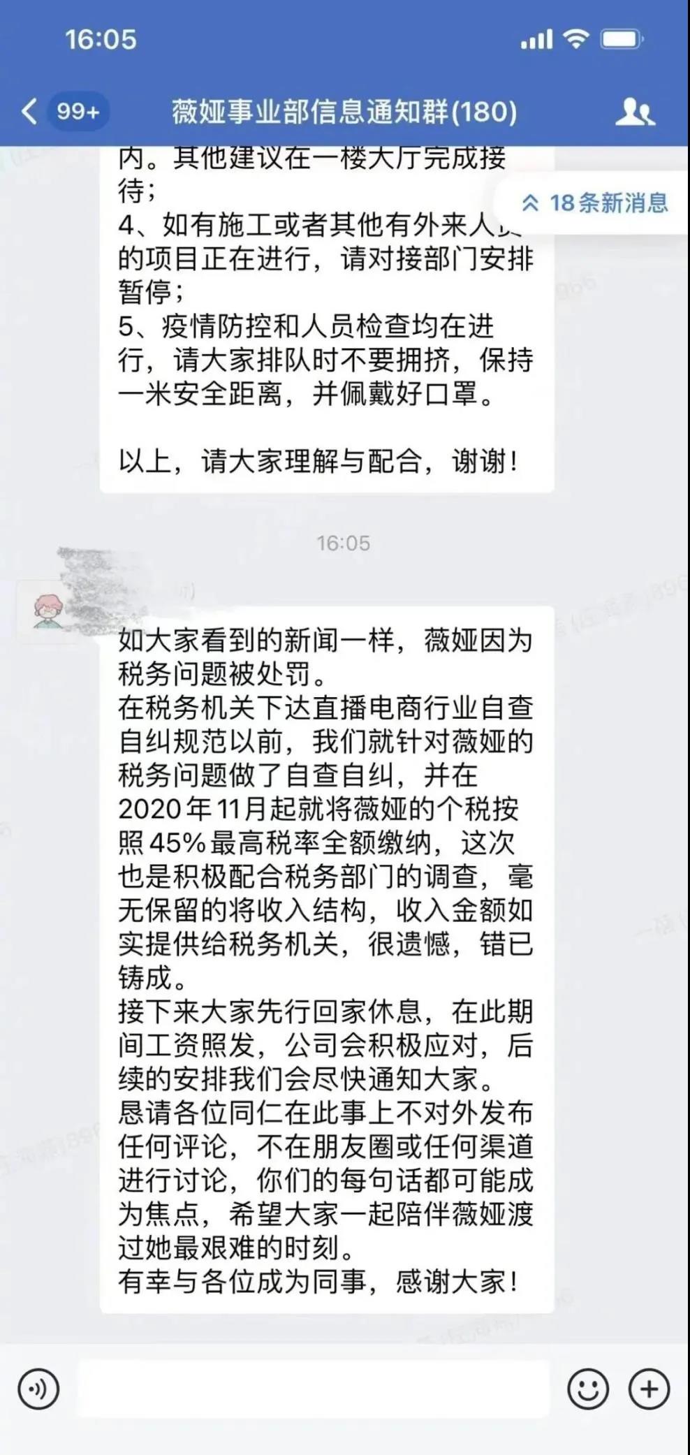 值得注意的是,20日下午,薇婭事業(yè)部信息通知群截圖流出,薇婭經(jīng)紀(jì)人王斯(古默)發(fā)言表示,“接下來請大家先行回家休息,在此期間工資照發(fā)”。一位接近薇婭事業(yè)部的行業(yè)人士告訴記者,此圖片消息屬實,后續(xù)公司將就此發(fā)布公告。