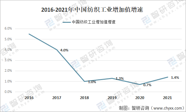 2016-2021年中國(guó)紡織工業(yè)增加值增速