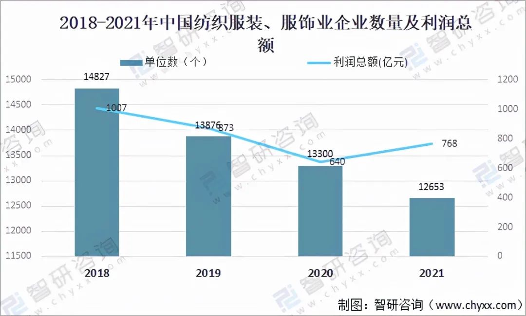 其中2021年中國(guó)紡織服裝、服裝業(yè)企業(yè)數(shù)量為12653個(gè),同比下降4.9%;紡織服裝、服裝業(yè)企業(yè)利潤(rùn)總額為768億元,同比增長(zhǎng)19.9%。