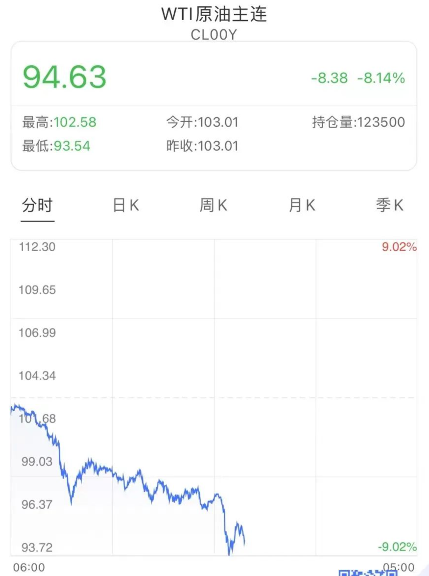 截至發(fā)稿,布油價(jià)格大跌7.85%至98.51美元/桶,3月1日以來首次盤中跌穿100美元/桶,較月高回落近40美元;WTI原油價(jià)格跌8.31%至94.45美元/桶,周一,該品種價(jià)格就已失守100美元大關(guān)。