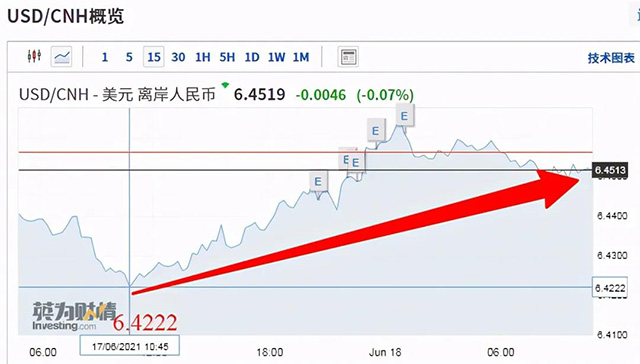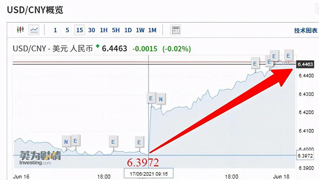 6月以來,在岸人民幣匯率累計(jì)下跌633個(gè)基點(diǎn),跌幅達(dá)0.99%;離岸人民幣匯率累計(jì)下跌近600點(diǎn),跌幅達(dá)到0.93%。6月18日,人民幣對(duì)美元匯率中間價(jià)報(bào)6.4361,較前一交易日下調(diào)63個(gè)基點(diǎn)。