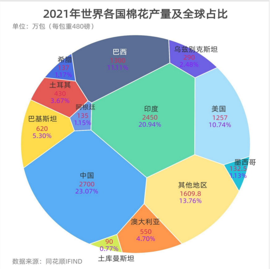 2021/2022年度,中國以2700萬包(每包重480磅)位居全球第一棉花生產(chǎn)國,占全球總產(chǎn)量的23.07%,印度以2450萬包的產(chǎn)量僅次于中國,而巴基斯坦棉花年產(chǎn)量為620萬包,占全球總產(chǎn)量的5.3%,位列第五名。巴基斯坦規(guī)劃部長表示,巴基斯坦將面臨糧食短缺,因?yàn)闅v史上最嚴(yán)重的洪災(zāi)造成農(nóng)作物損失。巴基斯坦45%的棉花作物被洪水沖走,水果、蔬菜和大米作物也遭受巨大損失。受此影響,如果產(chǎn)量下降,該國紡織行業(yè)將被迫進(jìn)口更多棉花,從而進(jìn)一步推高國際棉花市場(chǎng)價(jià)格。由于今年美國、巴西、其他國家的棉花作物產(chǎn)量下降,全球市場(chǎng)已面臨供應(yīng)減少。下圖為2021年全球棉花產(chǎn)量分布及全球占比,具體如下:
