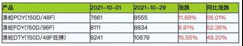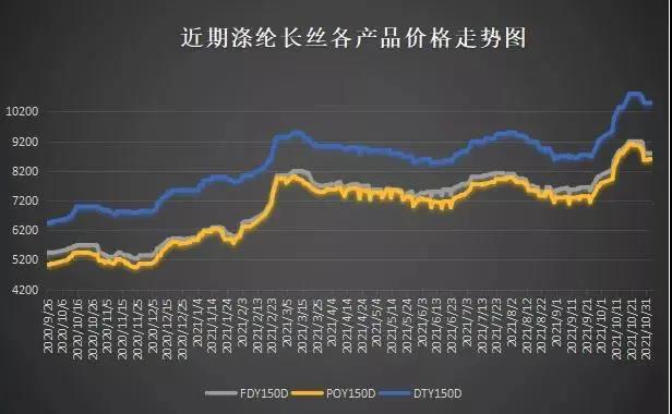 而下游織廠對(duì)目前原料價(jià)格抵觸情緒較大,根據(jù)價(jià)格監(jiān)測(cè)顯示,10月國內(nèi)滌綸長絲市場(chǎng)各產(chǎn)品價(jià)格創(chuàng)下近兩年的新高,截止10月29日江浙一帶主流工廠,滌綸POY(150D/48F)報(bào)價(jià)在8350—8600元/噸,滌綸DTY(150D/48F低彈)報(bào)價(jià)在10500—10800元/噸,滌綸FDY(150D/96F)報(bào)價(jià)在8750—8850元/噸。