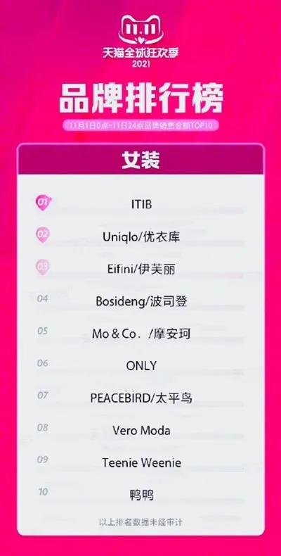 而現(xiàn)在,不僅韓都衣舍謀求IPO上市失敗,MG小象更是準(zhǔn)備閉店。到了今年雙十一的女裝排名榜單上,那些曾經(jīng)消費者耳熟能詳?shù)木€上品牌更是全部消失,取而代之的是線下反攻成功的國際大牌,和一些新出現(xiàn)的潮流品牌。