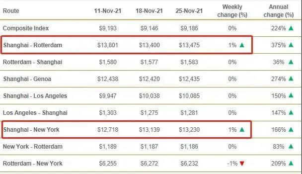 德魯里指數(shù)顯示,上海-鹿特丹的運(yùn)費(fèi)上漲1%即75美元,達(dá)到13475美元/FEU。同樣,上海-紐約的即期運(yùn)費(fèi)上漲1%至13230美元/FEU。上海-熱那亞、上海-洛杉磯的運(yùn)價(jià)徘徊在前幾周的水平附近,預(yù)計(jì)未來(lái)一周利率將保持穩(wěn)定。