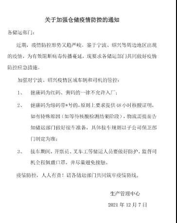 近期,疫情防控形勢(shì)又趨嚴(yán)峻。鑒于寧波、紹興等周邊地區(qū)出現(xiàn)的疫情,為有效阻斷病毒傳播蔓延,現(xiàn)要求各儲(chǔ)運(yùn)部門共同做好疫情防控應(yīng)急措施。