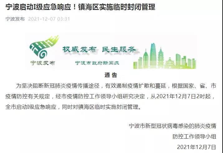 12月7日凌晨,“寧波發(fā)布”官方發(fā)布通知稱,從2021年12月7日2時(shí)起,寧波全市啟動(dòng)I級(jí)應(yīng)急響應(yīng),同時(shí)對(duì)鎮(zhèn)海區(qū)臨時(shí)實(shí)施封閉管理。