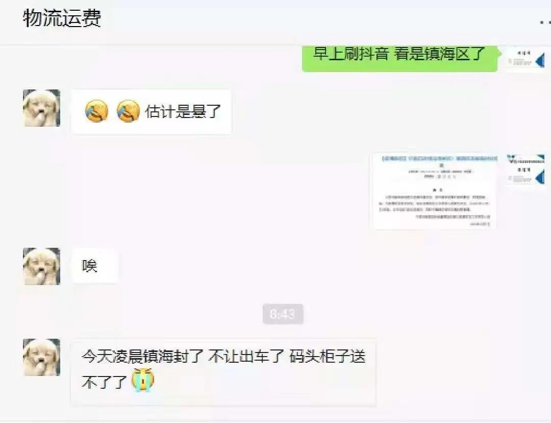 有物流公司表示,“鎮(zhèn)海封掉之后不讓出車,碼頭柜子也送不了了,本來(lái)在截單的訂單也不能提柜裝箱,現(xiàn)在都在等通知。”