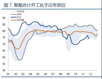 從分項來看,截至2021年12月2日,國內(nèi)滌綸長絲開工負(fù)荷77.11%,環(huán)比-6.19%;滌綸短纖開工負(fù)荷67.02%,環(huán)比-1.31%;聚酯瓶片開工負(fù)荷維持78.46%不變。整體開工也處于近5年低位。
